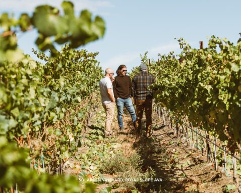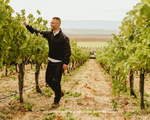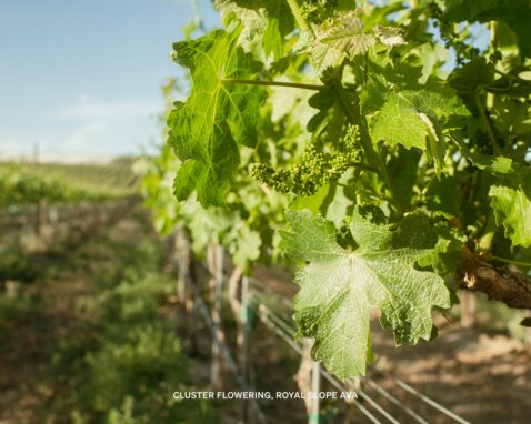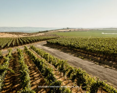 The vineyard parcels contributing to the 2021 Matthews Royal Slope Claret faced significant weather-related challenges during bloom, resulting in substantial shatter and even lower yields than anticipated. Despite this, the vines demonstrated remarkable resilience. Growers responded to the heat dome event with strategic canopy management, leaving increased leaf cover to shield clusters from extreme temperatures, and applying continuous drip irrigation to keep vines hydrated under severe stress.